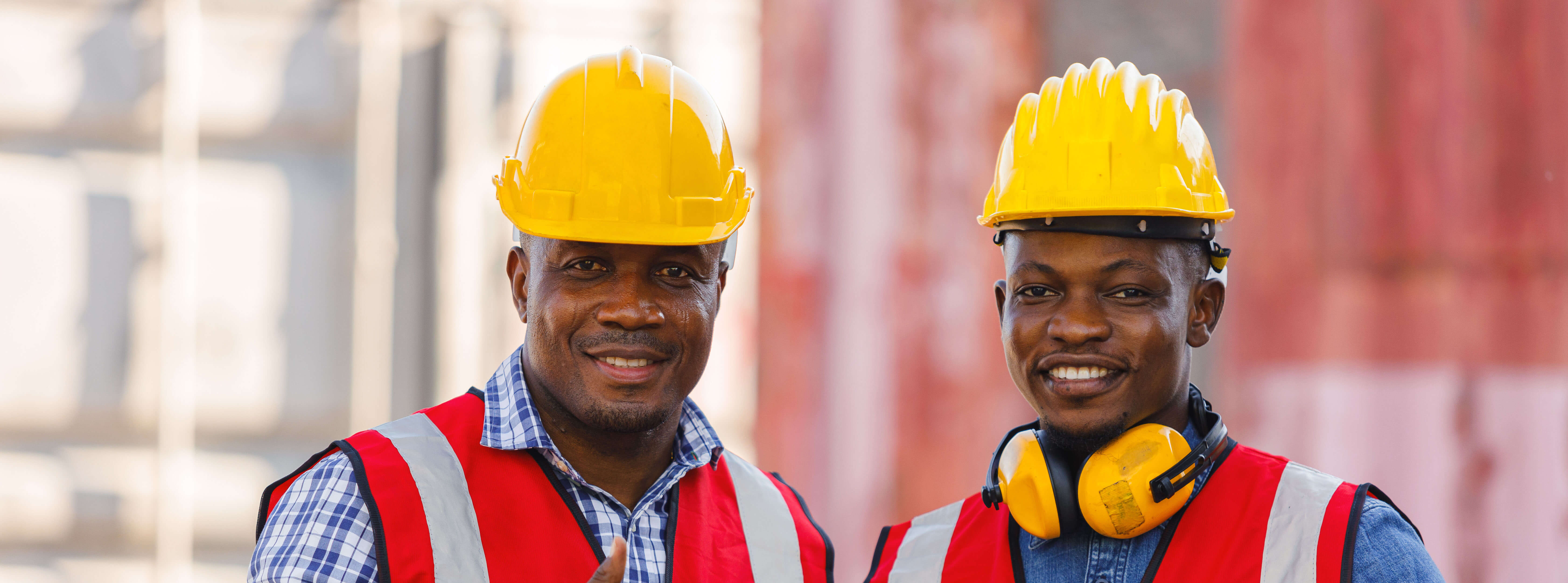 blue collar workers talking on lunch break at warehouse