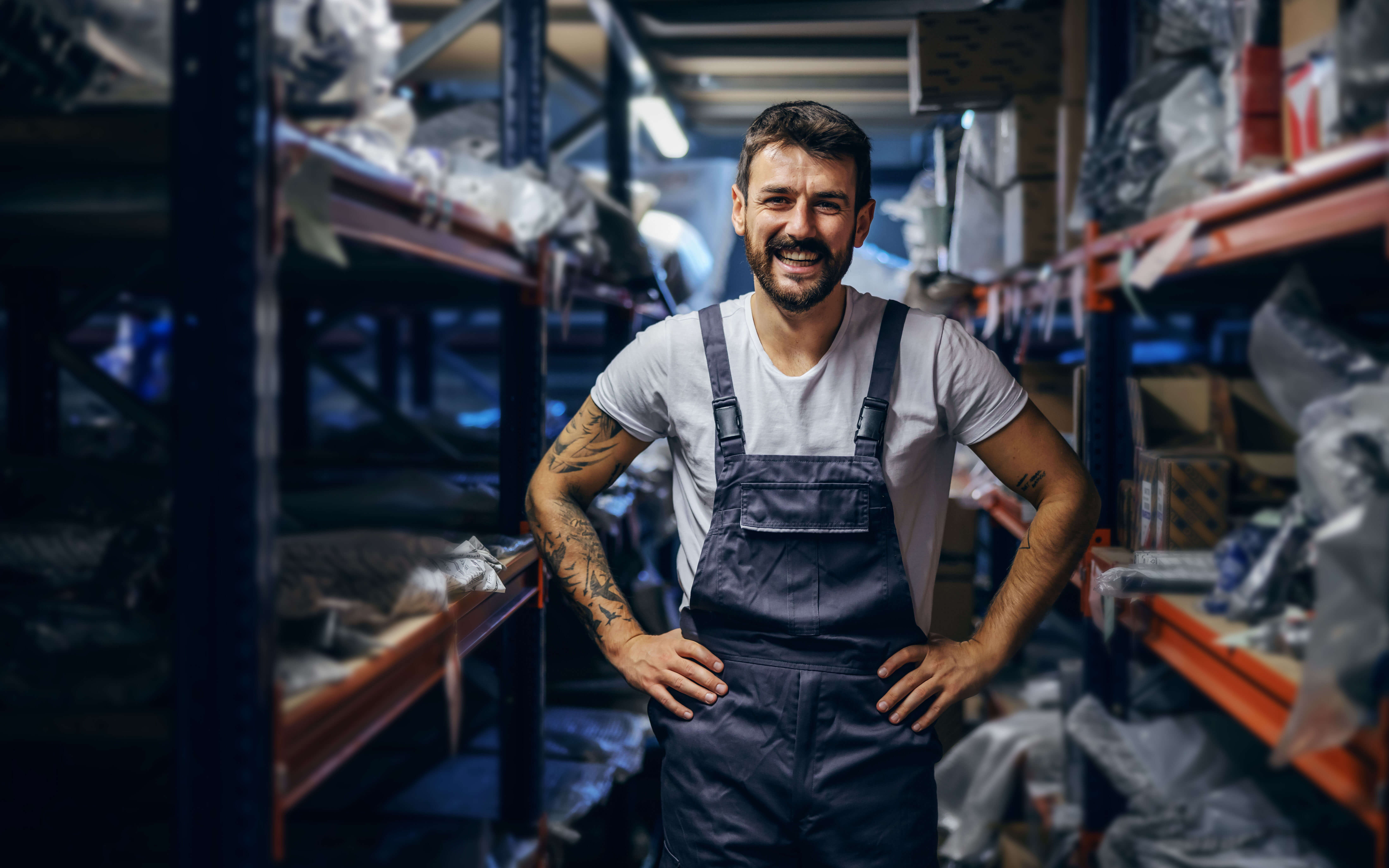 Smiling tattooed bearded worker in overalls standing in storage with hands on hips.